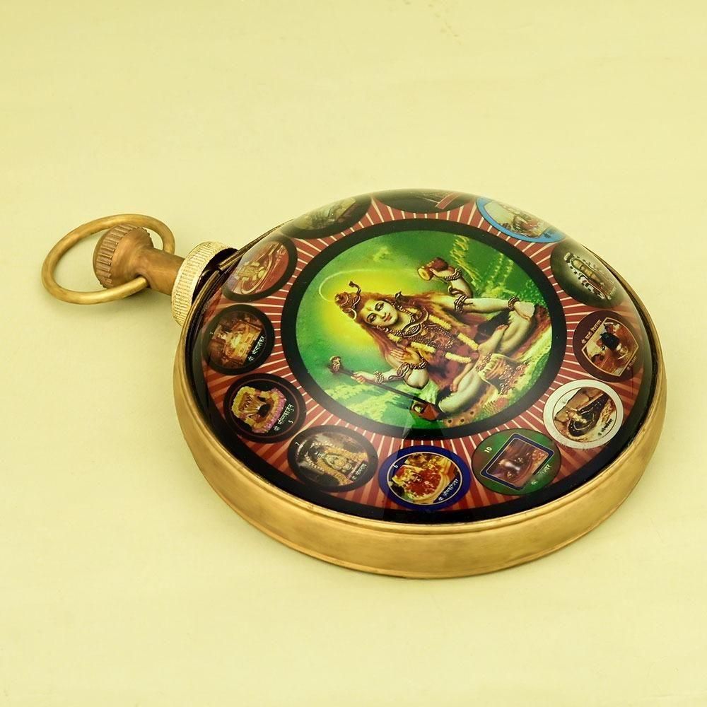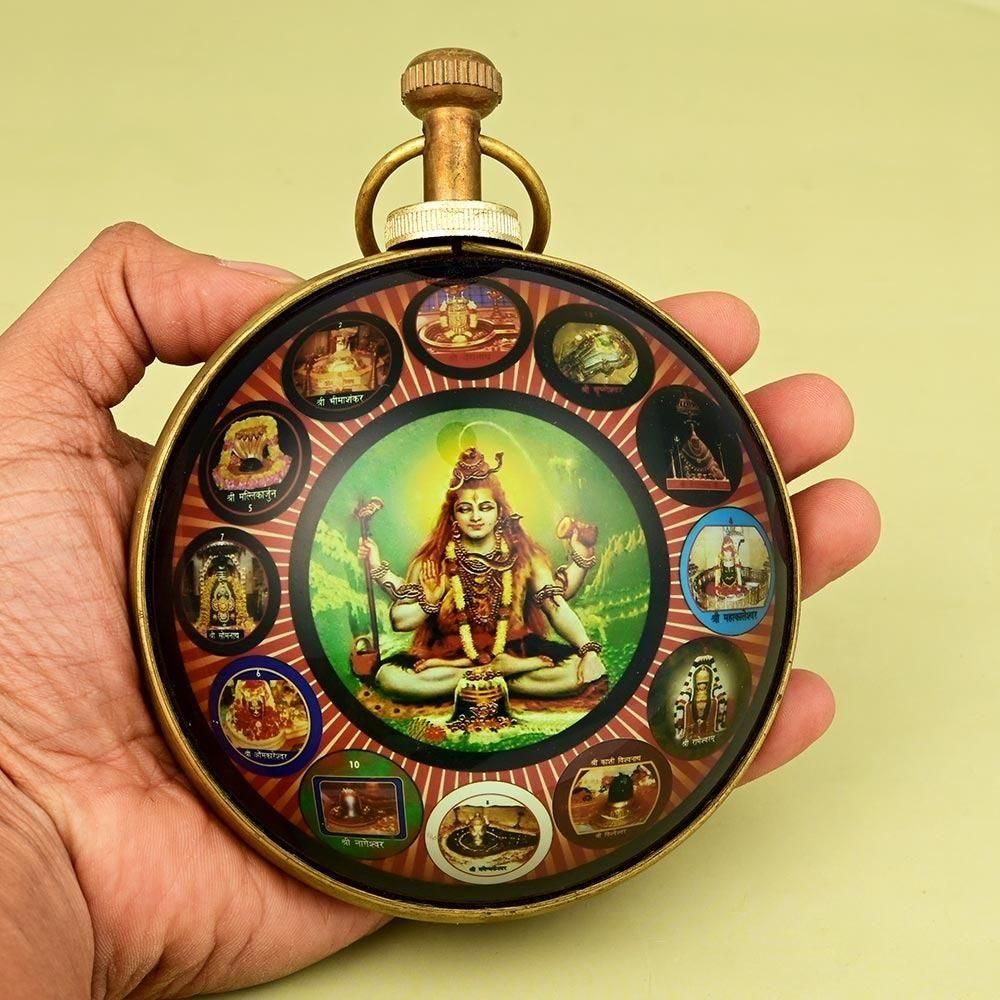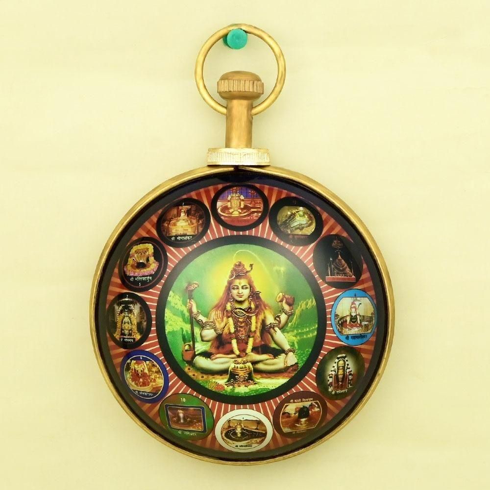 シヴァ神と12のジョーティルリンガが拡大して見えるよう、表面がドーム状のクリスタルガラスで覆われた、重厚な真鍮製のハンギング・12ジョーティルリンガです。ドアや壁、祭壇などに掛けてお祀り頂けます。
