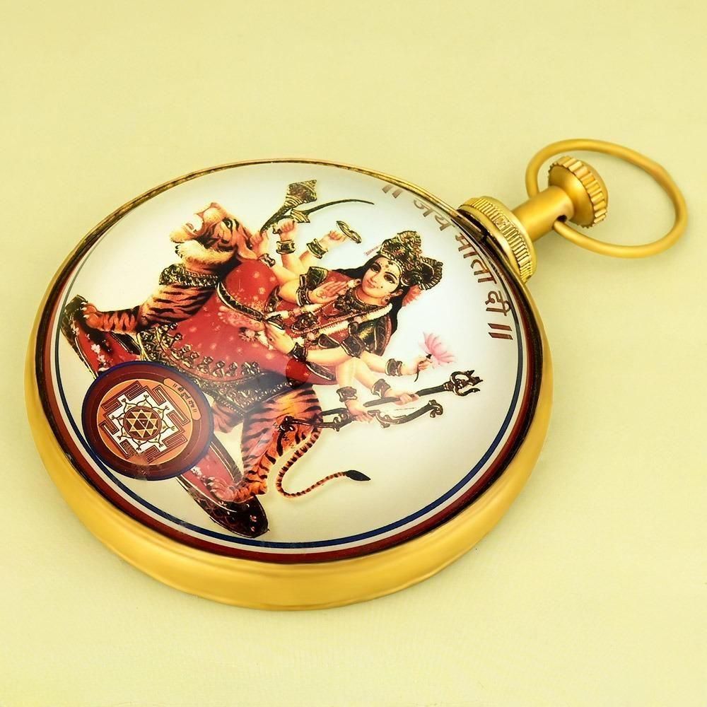 ドゥルガー女神とヤントラが、拡大して見えるよう、表面がドーム状のクリスタルガラスで覆われた、重厚な真鍮製のヤントラです。ドアや壁、祭壇などに掛けてお祀り頂けます。