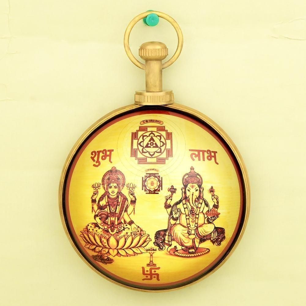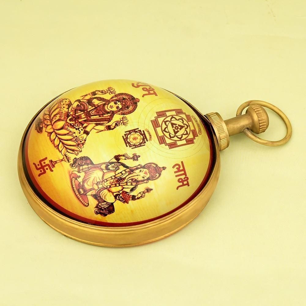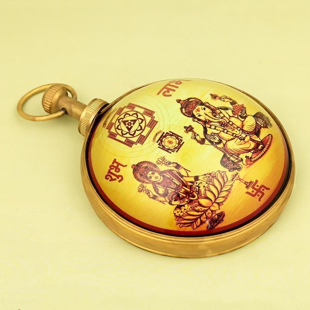 ガネーシャ神とラクシュミー女神、そしてヤントラが、拡大して見えるよう、表面がドーム状のクリスタルガラスで覆われた、重厚な真鍮製のヤントラです。ドアや壁、祭壇などに掛けてお祀り頂けます。