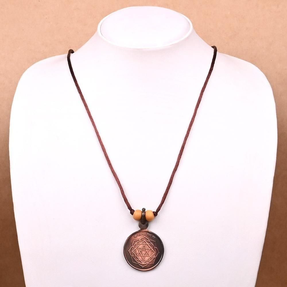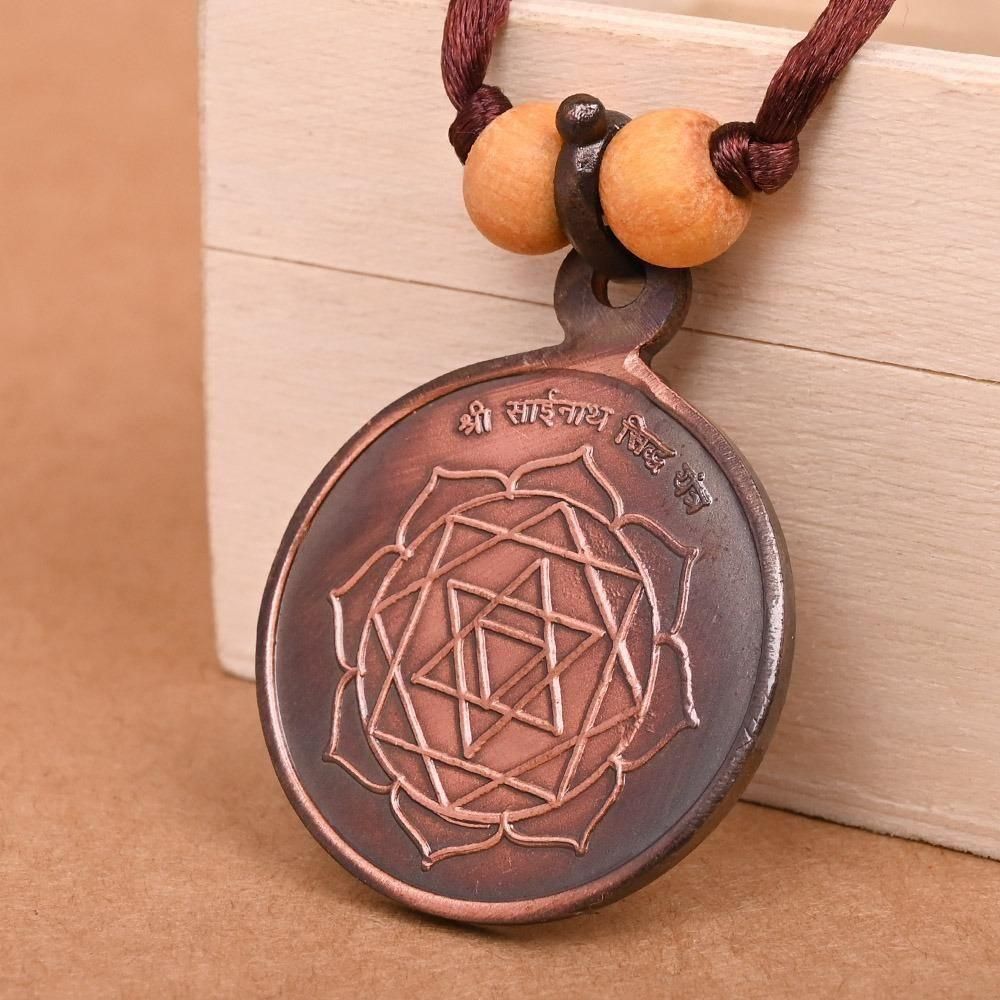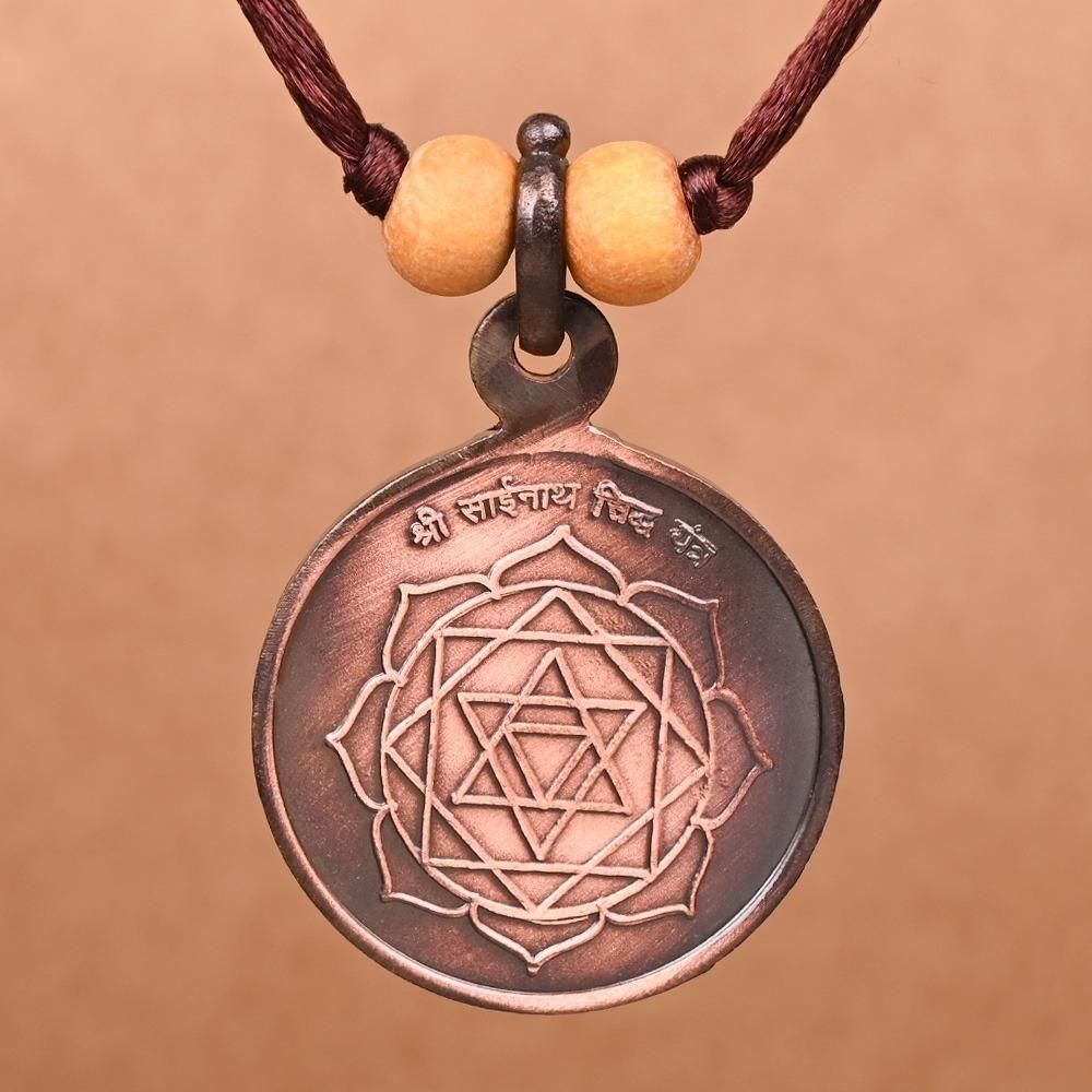 神の化身として崇められるサイババのヤントラとサイババが描かれた、浄化作用の強い銅製のペンダントです。表面にはサイババ・ヤントラが描かれ、裏面にはサイババの絵が描かれています。