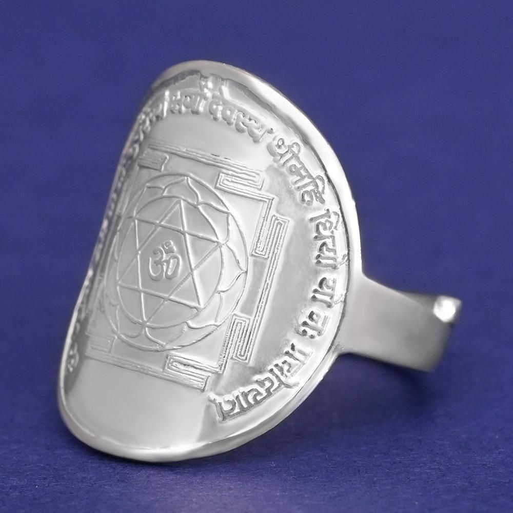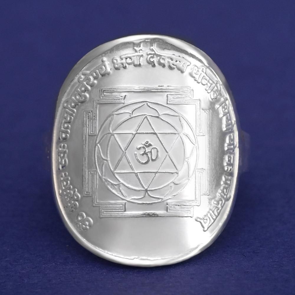 ヴェーダの母として神聖な知識で私たちを満たすガーヤトリー・ヤントラが描かれたシルバーの美しいリングです。表面にはガーヤトリー・ヤントラが描かれ、裏面にはガーヤトリー女神の絵が描かれています。