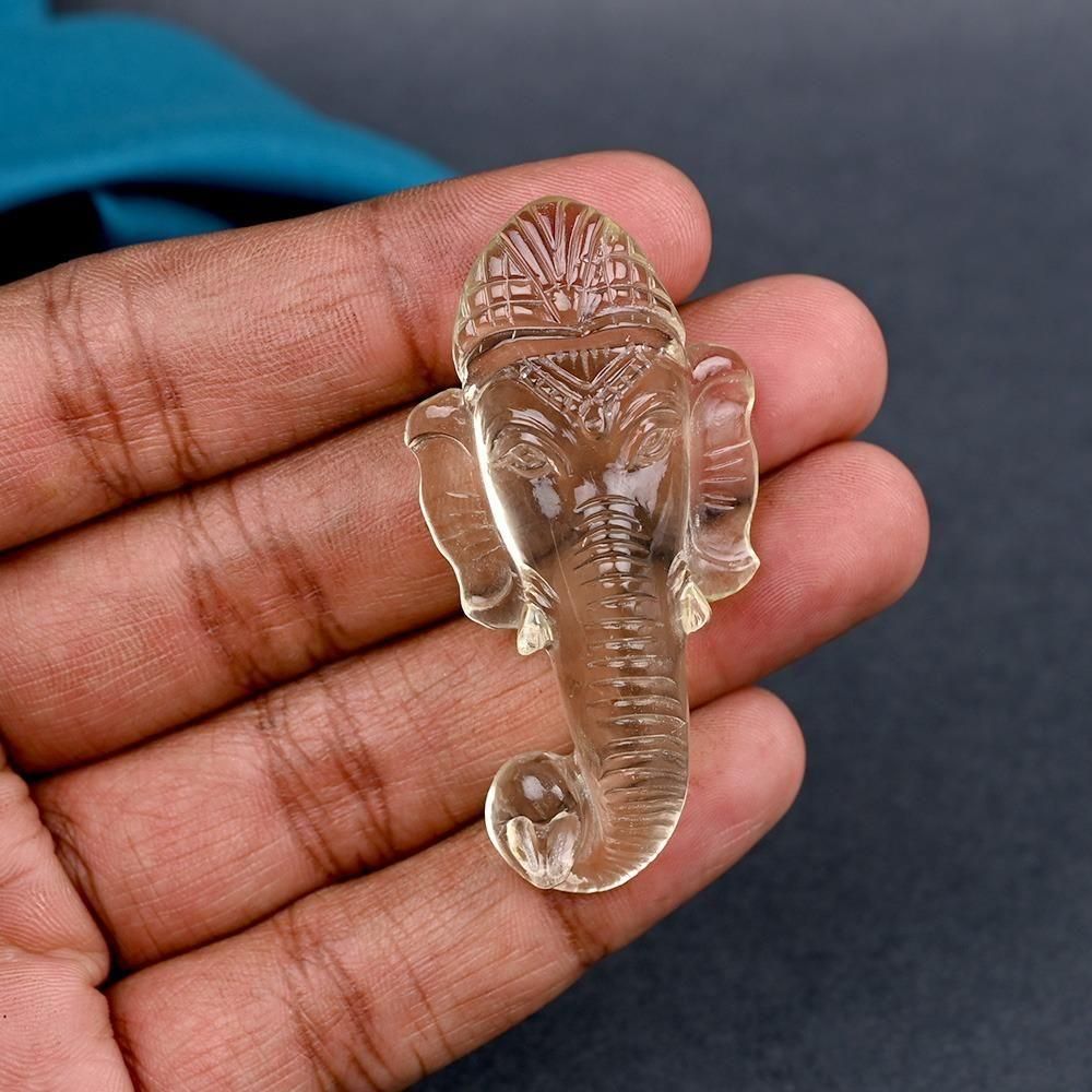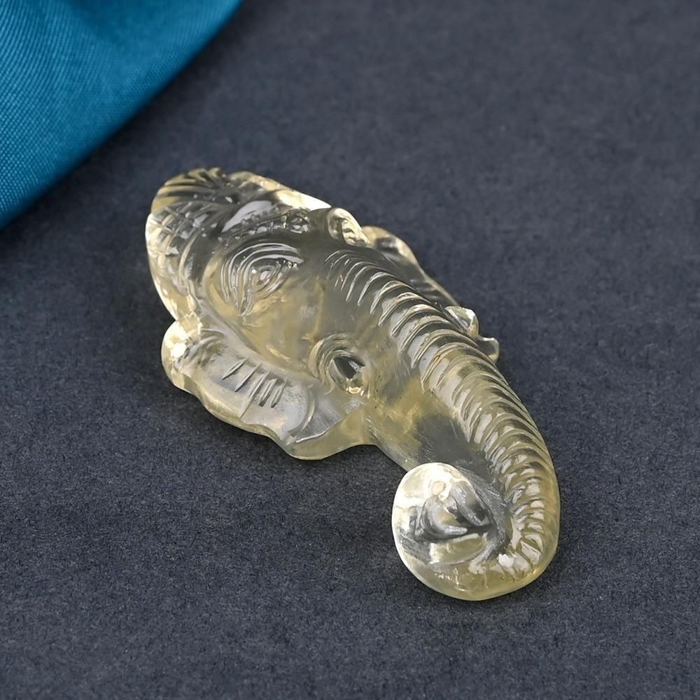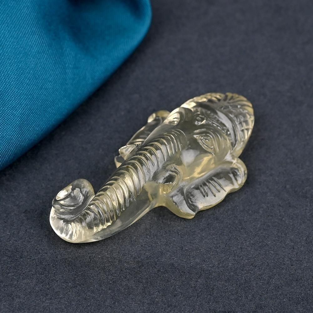 美しいレモントパーズに彫刻されたガネーシャ神の御顔です。珍しい右曲がりの鼻で彫刻されています。祭壇にお祀りしたり、お守りとしてお持ちいただくことができます。