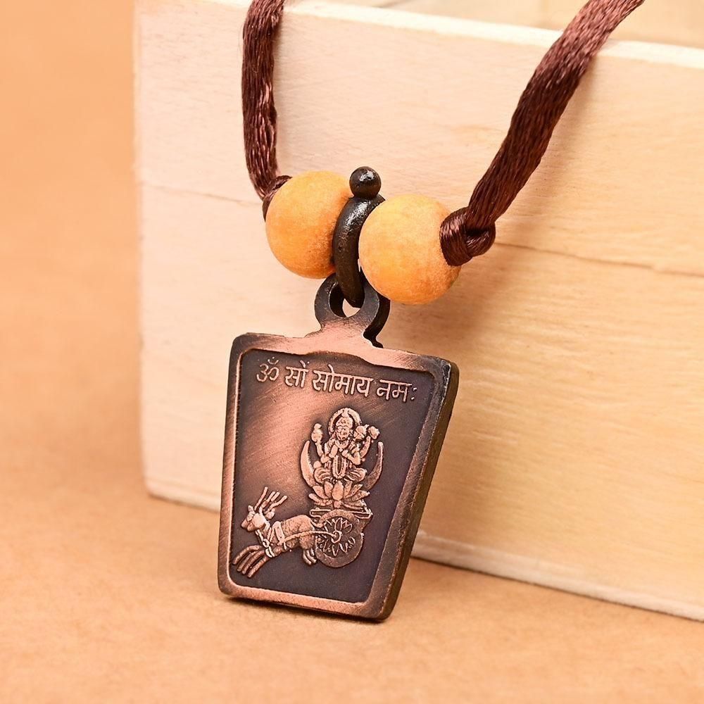 このペンダントトップは浄化作用の強い銅製で、裏表にチャンドラ・ヤントラとチャンドラ神が描かれています。