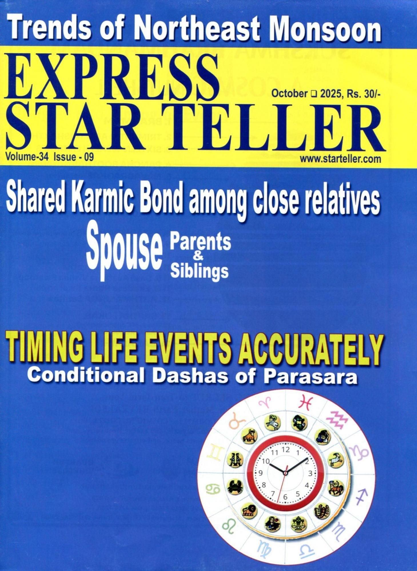 「EXPRESS STAR TELLER」2025年10月号(Volume-34, Issue-09)は、インド占星術とスピリチュアリティの探求者のための包括的な月刊誌です。今号の特集「人生の出来事を正確にタイミングする―パラーシャラの条件付きダシャー」では、ヴェーダ占星術の最も高度な予測技法であるダシャーシステムを初心者向けに丁寧に解説します。また、配偶者・親・兄弟姉妹間の「共有されたカルマの絆」についての深い洞察、マハーラーシュトラ州の稀少なラーフ・ケートゥ寺院の紹介、プージャ・スワミ・ダヤーナンダ・サラスワティ師の叡智に満ちた教え、北東モンスーンの占星気象学的分析など、多彩なコンテンツを収録。さらに、タロット実践レッスン、病気への占星術的洞察、アーディ・カイラーシュとオーム・パルヴァットの神秘的領域の探訪など、82ページにわたって実践的知識とスピリチュアルな智慧を提供します。