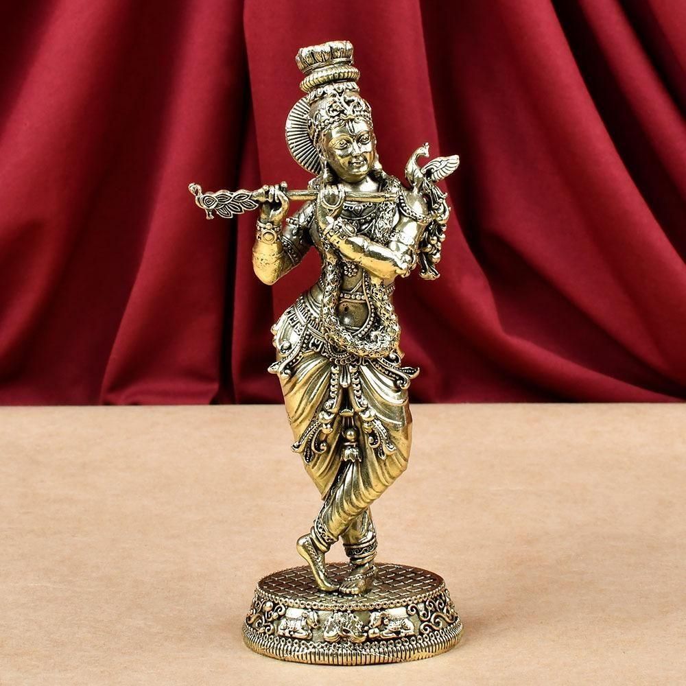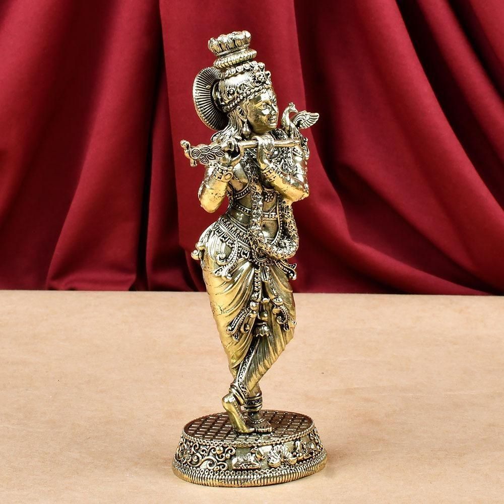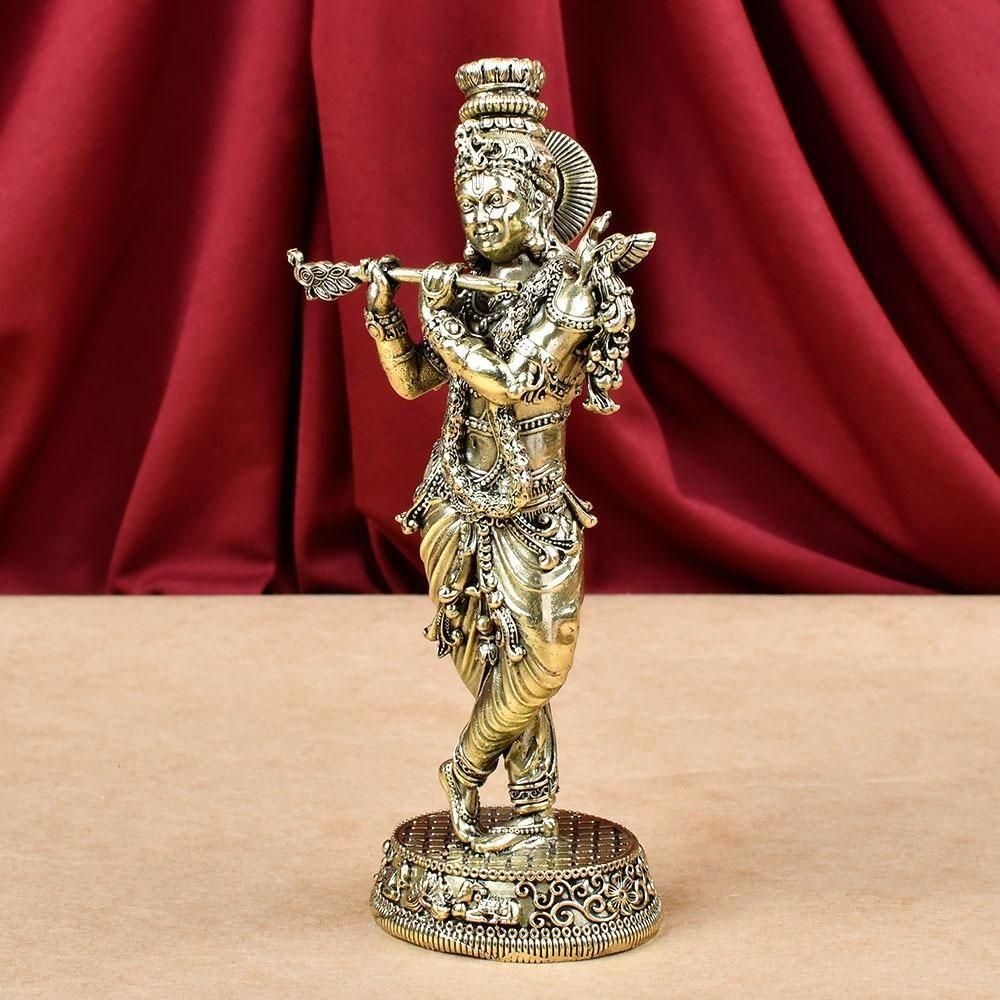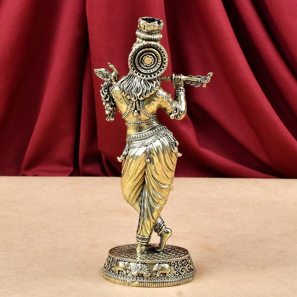 神聖な8種の合金であるアシュタダートゥで作られた、優美な立ち姿でムラリー(笛)を奏でるクリシュナ神像です。