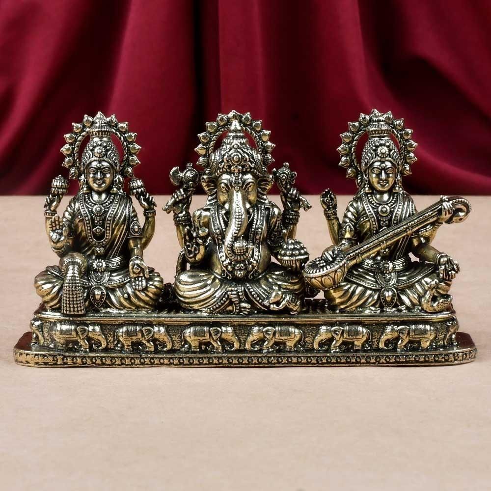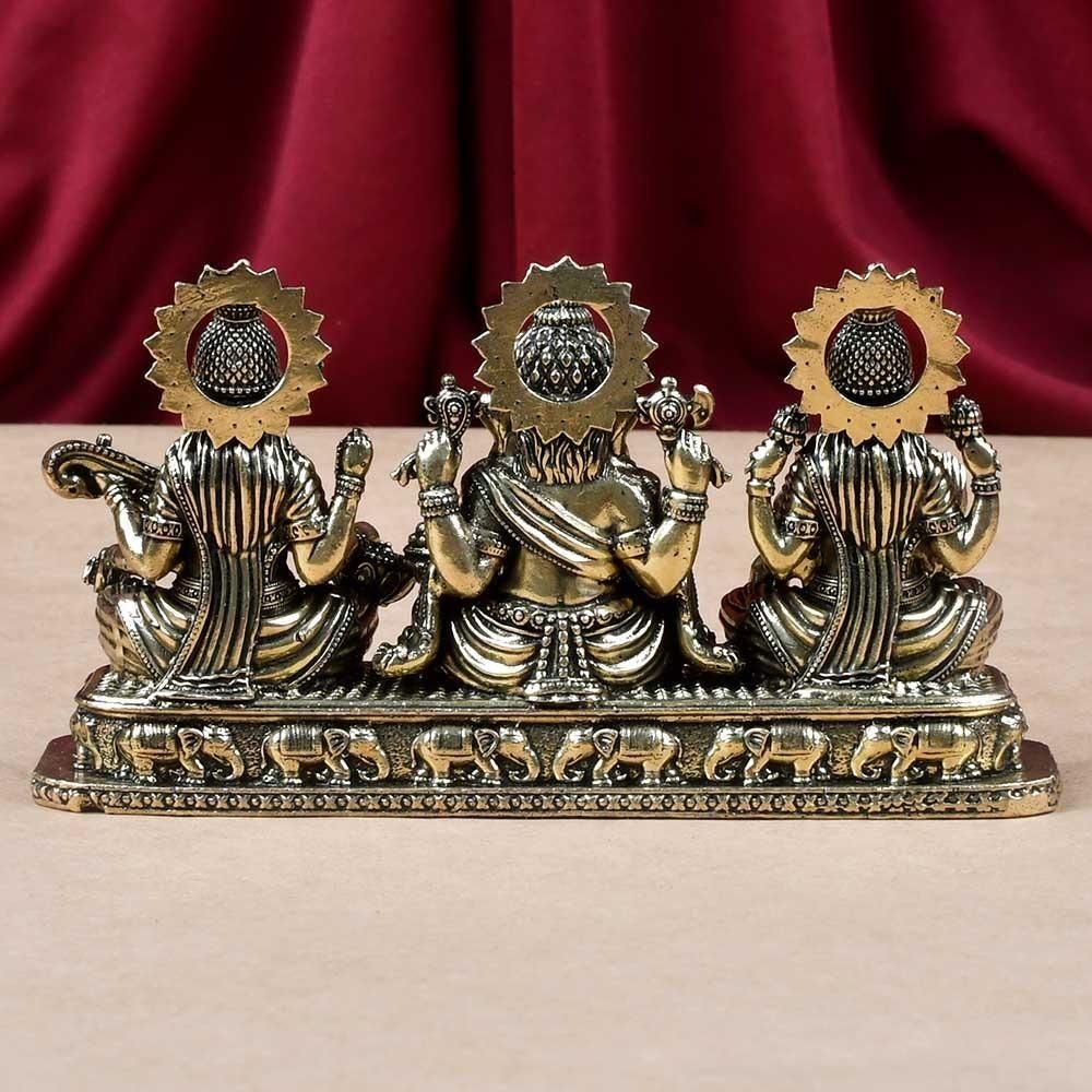 神聖な8種の合金であるアシュタダートゥで作られた、豪華絢爛なガネーシャ・ラクシュミー・サラスワティーの神像です。この3神への礼拝により、あらゆる障壁が取り除かれ、繁栄と幸運がもたらされると信じられています。