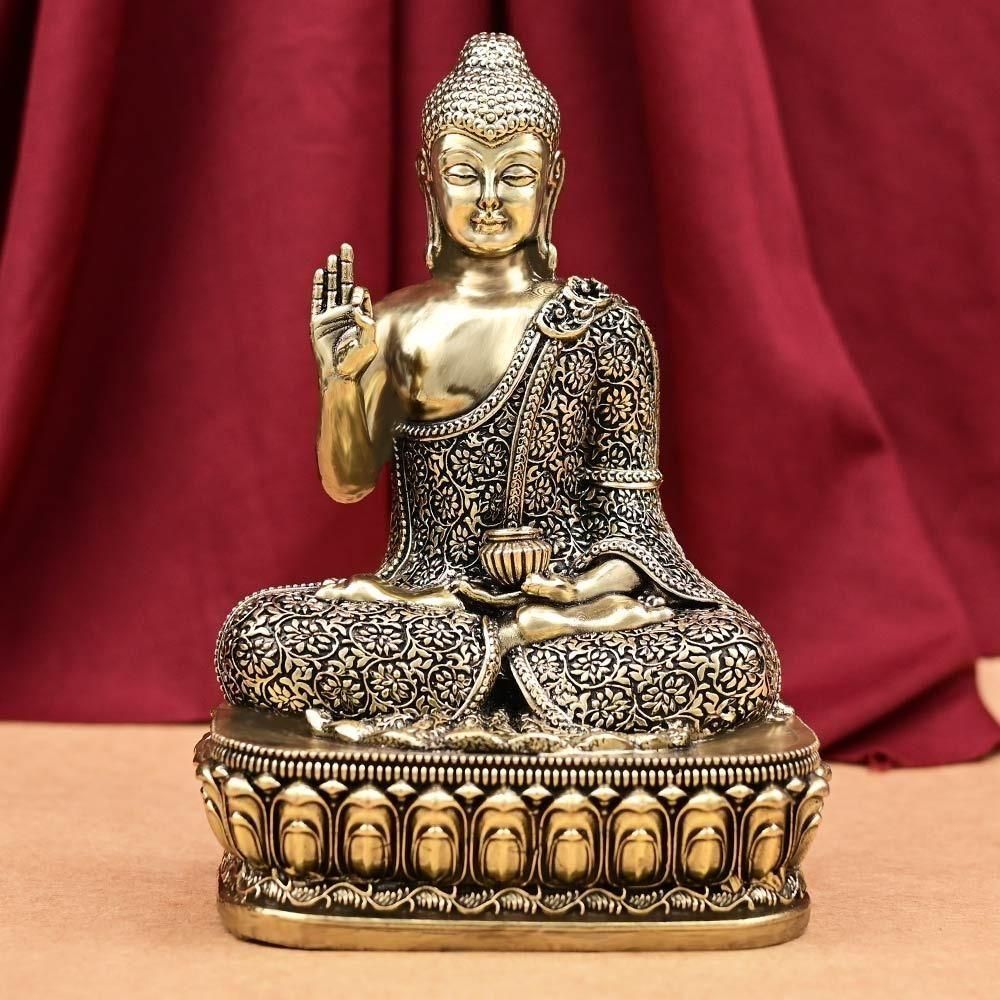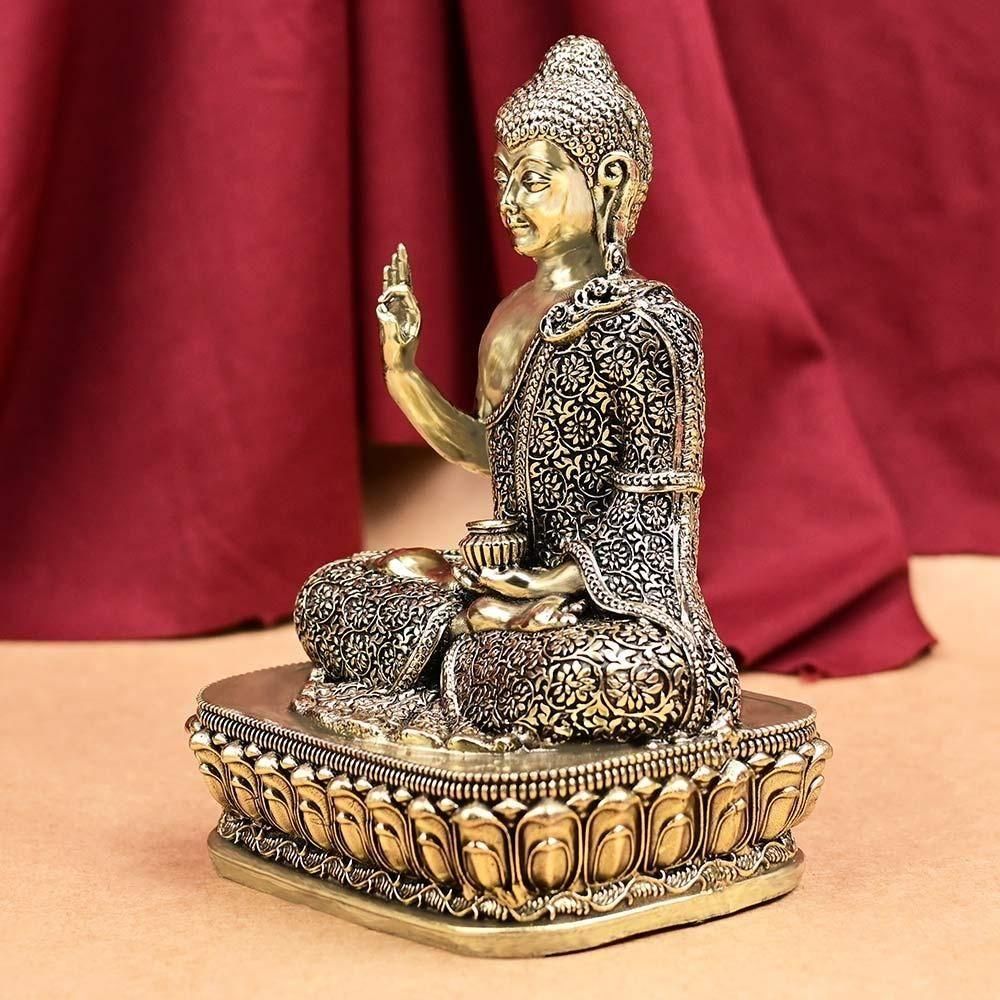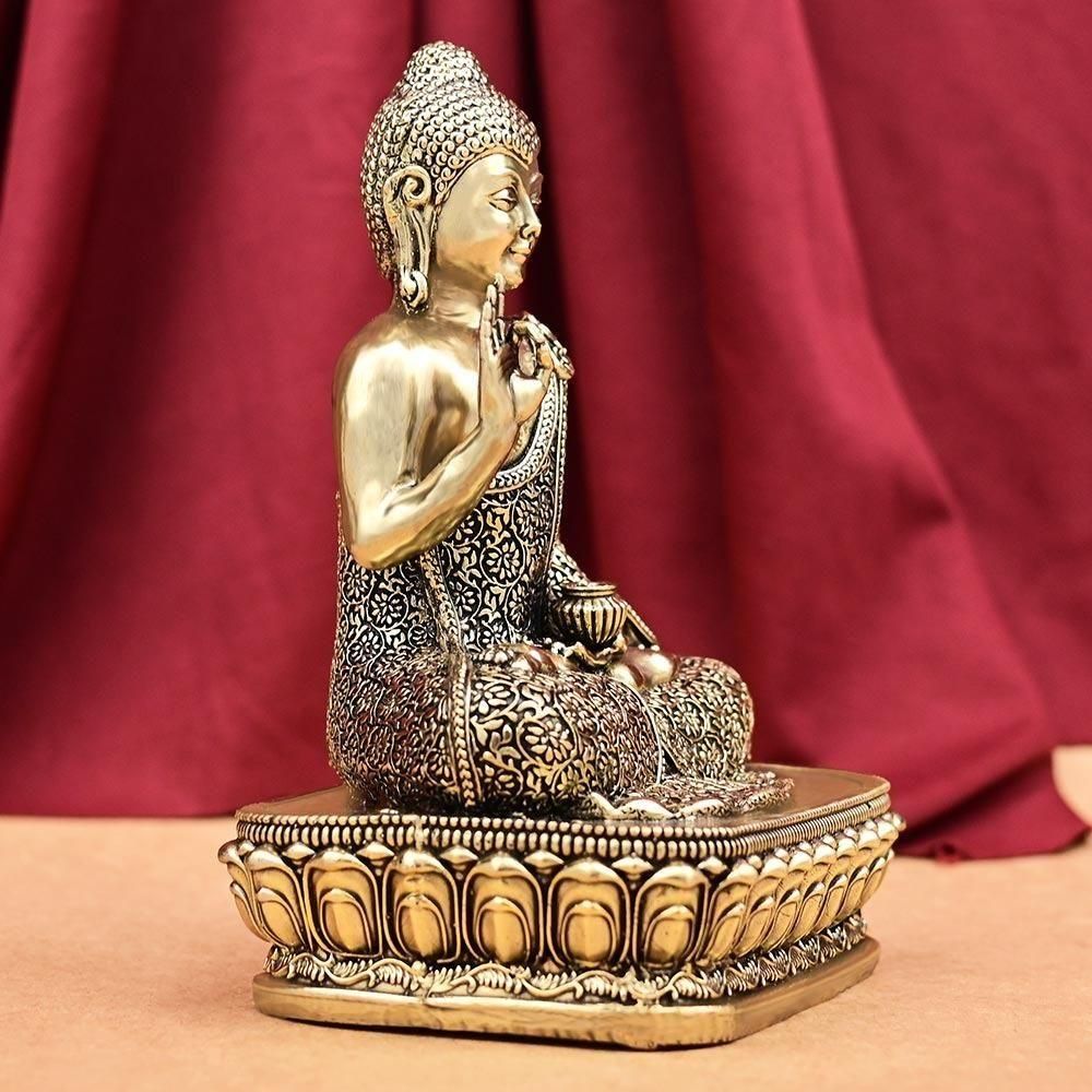 神聖な8種の合金であるアシュタダートゥで作られた、インドではヴィシュヌ神9番目の化身とされる仏陀の座像です。仏陀の説く心の寂静を象徴する穏やかな表情が際立ちます。